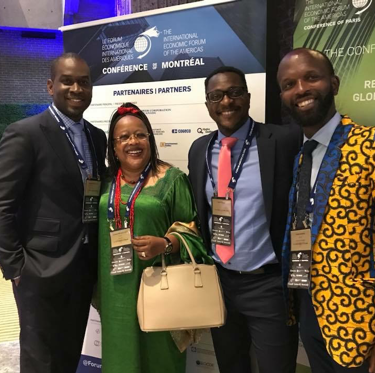 From left to right, SsahiPath Co-Founder and Chief Executive Officer, Jacques NdoutouMve, MAFUBO Founder and President, Dr. Hon Monique Mujawamarya, SsahiPath President and Chief Technology Officer Dr. Erick Tidiane, and Levesque Strategies Senior Consultant Strategy and Business Outreach, Mr. Irenee Rutema, photographed in Montreal at the 2018 International Economic Forum of the Americas.
